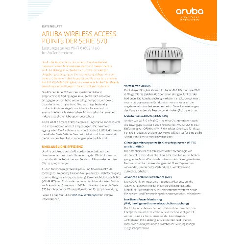 - Die Outdoor Access Points der Aruba 570-Serie bieten leistungsstarke drahtlose Konnektivität für den Außenbereich wie Lagerhäuser, Stadien und andere anspruchsvolle Umgebungen. Die Aruba 570-Serie unterstützt den neuesten Wi-Fi 6-Standard und kann eine maximale aggregierte Datenrate von 3 Gbit/s (HE80/HE40)) erreichen, um hohe Geschwindigkeit und Zuverlässigkeit zu liefern. Die Outdoor APs der Aruba 570-Serie sind außerdem darauf ausgelegt, eine verbesserte Benutzererfahrung zu bieten, indem wichtige Wi-Fi-Optimierungstechnologien für eine höhere Wi-Fi-Effizienz und optimierte Sendezeit für Kunden integriert wurden.