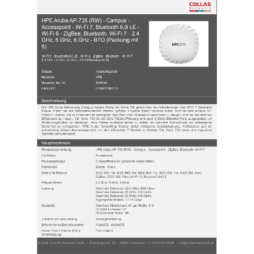Jetzt anmeldenProduktinformationen "HPE Aruba AP-735 (RW) - Campus - Accesspoint - Wi-Fi 7, Bluetooth 6.0 LE - Wi-Fi 6 - ZigBee, Bluetooth, Wi-Fi 7 - 2.4 GHz, 5 GHz, 6 GHz - BTO (Packung mit 5)"