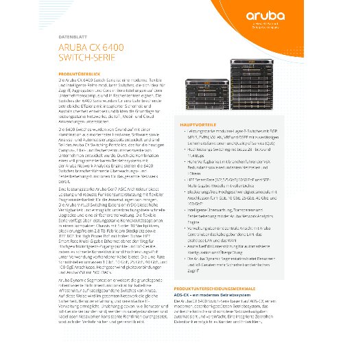 - Die HPE Aruba Networking CX 6400 Switch Series ist eine moderne, flexible und intelligente Reihe modularer AOS-CX Switches, die sich ideal für Bereitstellungen auf dem Unternehmenscampus und in Rechenzentren eignen. Mit seinem Cloud-orientierten Design, das ein voll programmierbares Betriebssystem mit NAE kombiniert, erweitert Aruba CX 6400 die branchenführende Überwachung und Fehlerbehebung im Netzwerk. Die leistungsstarke Architektur von Aruba Gen7 ASIC bietet eine schnelle, blockierungsfreie Leistung, damit Ihr Netzwerk für die unvorhersehbaren Anforderungen von morgen gerüstet ist. HPE Aruba Networking Virtual Switching Extension (VSX) bietet hohe Verfügbarkeit und ermöglicht schnelle unterbrechungsfreie Upgrades. Die Unterstützung von HPE Aruba Networking Switch Multi-Edit Software und der HPE Aruba Networking CX Mobile App stellt sicher, dass die Konfigurationen fehlerfrei und einfach bereitzustellen sind. Diese Serie bietet ein kompaktes Chassis mit 5 und 10 Steckplätzen und einer Auswahl an Line-Rate-Schnittstellen, einschließlich 25 GbE, 100 GbE sowie 60 W PoE mit voller Dichte und HPE Smart Rate Multi-Gigabit-Ethernet, ideal für Zugriff, Aggregation und Core-Bereitstellungen.