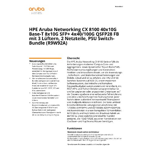 - Die HPE Aruba Networking CX 8100 Serie erfüllt die Anforderungen moderner Campus-Core- und Aggregations- sowie dynamischer Top-of-Rack (ToR)-Rechenzentrumsumgebungen und bietet einen flexiblen und innovativen Ansatz, um die Anwendungs-, Sicherheits- und Skalierbarkeitsanforderungen von Mobile, Cloud und IoT zu erfüllen. Die HPE CX 8100 Switches basieren auf AOS-CX, einem modernen Softwaresystem, das kritische und komplexe Netzwerkaufgaben automatisiert und vereinfacht, mit REST-APIs und Python-Skripten programmierbar ist und bei geplanten oder ungeplanten Ereignissen auf der Steuerungsebene eine verbesserte Fehlertoleranz und eine unterbrechungsfreie Nutzung bietet. Jeder Switch bietet außerdem netzwerkweite Transparenz und Analysefunktionen in Echtzeit. Die Serie umfasst branchenführende Leitungsraten-Anschlüsse mit 1/10GbE (SFP/SFP+) und 40/100GbE (QSFP+/QSFP28) mit Konnektivität in einem kompakten 1U-Formfaktor. 4x10 Gbit/s und 4x25 Gbit/s mit Breakout-Kabeln an 40/100-G. Diese Switches sind ideal für Kunden geeignet, die 1GbE/10GbE aus einer Kombination von Glasfaser- und Kupferanschlüssen benötigen.
