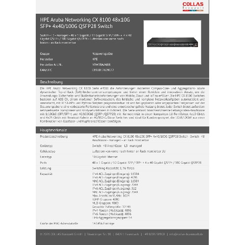 - Die HPE Aruba Networking CX 8100 Serie erfüllt die Anforderungen moderner Campus-Core- und Aggregations- sowie dynamischer Top-of-Rack (ToR)-Rechenzentrumsumgebungen und bietet einen flexiblen und innovativen Ansatz, um die Anwendungs-, Sicherheits- und Skalierbarkeitsanforderungen von Mobile, Cloud und IoT zu erfüllen. Die HPE CX 8100 Switches basieren auf AOS-CX, einem modernen Softwaresystem, das kritische und komplexe Netzwerkaufgaben automatisiert und vereinfacht, mit REST-APIs und Python-Skripten programmierbar ist und bei geplanten oder ungeplanten Ereignissen auf der Steuerungsebene eine verbesserte Fehlertoleranz und eine unterbrechungsfreie Nutzung bietet. Jeder Switch bietet außerdem netzwerkweite Transparenz und Analysefunktionen in Echtzeit. Die Serie umfasst branchenführende Leitungsraten-Anschlüsse mit 1/10GbE (SFP/SFP+) und 40/100GbE (QSFP+/QSFP28) mit Konnektivität in einem kompakten 1U-Formfaktor. 4x10 Gbit/s und 4x25 Gbit/s mit Breakout-Kabeln an 40/100-G. Diese Switches sind ideal für Kunden geeignet, die 1GbE/10GbE aus einer Kombination von Glasfaser- und Kupferanschlüssen benötigen.