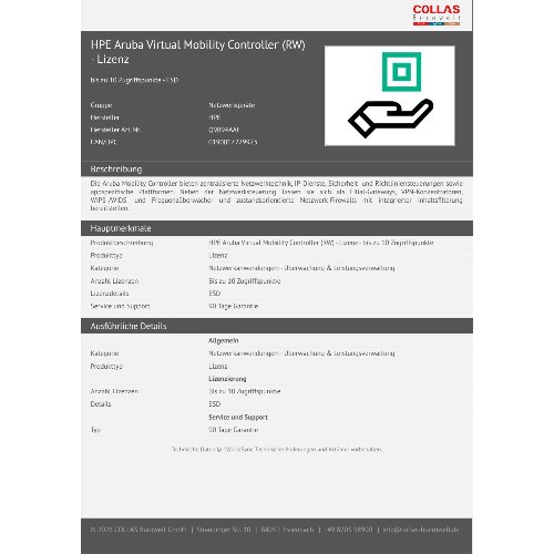 Jetzt anmeldenProduktinformationen "HPE Aruba Virtual Mobility Controller (RW) - Lizenz"