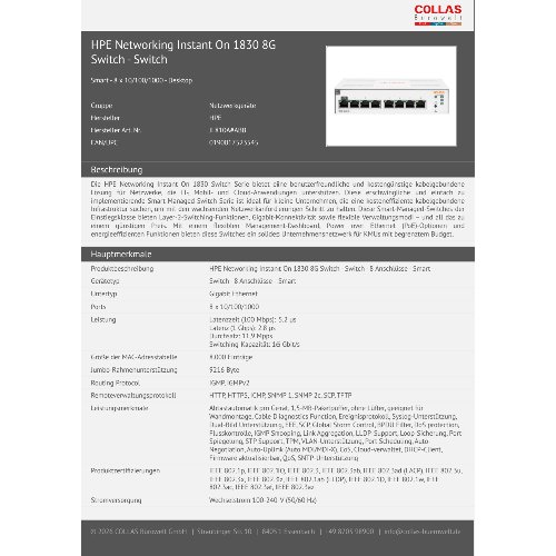 - Die HPE Networking Instant On 1830 Switch Serie bietet eine benutzerfreundliche und kostengünstige kabelgebundene Lösung für Netzwerke, die IT-, Mobil- und Cloud-Anwendungen unterstützen. Diese erschwingliche und einfach zu implementierende Smart-Managed-Switch Serie ist ideal für kleine Unternehmen, die eine kosteneffiziente kabelgebundene Infrastruktur suchen, um mit den wachsenden Netzwerkanforderungen Schritt zu halten. Diese Smart-Managed-Switches der Einstiegsklasse bieten Layer-2-Switching-Funktionen, Gigabit-Konnektivität sowie flexible Verwaltungsmodi – und all das zu einem günstigen Preis. Mit einem flexiblen Management-Dashboard, Power over Ethernet (PoE)-Optionen und energieeffizienten Funktionen bieten diese Switches ein solides Unternehmensnetzwerk für KMUs mit begrenztem Budget.