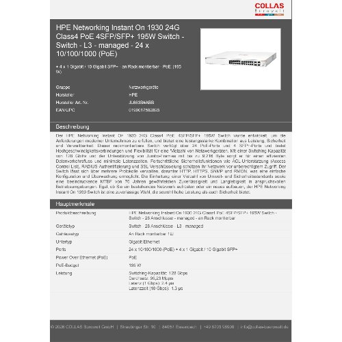 - Der HPE Networking Instant On 1930 24G Class4 PoE 4SFP/SFP+ 195W Switch wurde entwickelt, um die Anforderungen moderner Unternehmen zu erfüllen, und bietet eine leistungsstarke Kombination aus Leistung, Sicherheit und Verwaltbarkeit. Dieser rackmontierbare Switch verfügt über 24 PoE-Ports und 4 SFP+-Ports und bietet Hochgeschwindigkeitsverbindungen und Flexibilität für eine Vielzahl von Netzwerkgeräten. Mit einer Switching-Kapazität von 128 Gbit/s und der Unterstützung von Jumbo-Frames mit bis zu 9.216 Byte sorgt er für einen effizienten Datenverkehrsfluss und minimale Latenzzeiten. Fortschrittliche Sicherheitsfunktionen wie ACL-Unterstützung (Access Control List), RADIUS-Authentifizierung und SSL-Verschlüsselung schützen Ihr Netzwerk vor unberechtigtem Zugriff. Der Switch lässt sich über mehrere Protokolle verwalten, darunter HTTP, HTTPS, SNMP und RMON, was eine einfache Konfiguration und Überwachung ermöglicht. Die Einhaltung einer Vielzahl von Umwelt- und Sicherheitsstandards sowie eine beeindruckende MTBF von 76 Jahren gewährleisten Zuverlässigkeit und Langlebigkeit in anspruchsvollen Betriebsumgebungen. Egal, ob Sie ein bestehendes Netzwerk aufrüsten oder ein neues aufbauen, der HPE Networking Instant On 1930 Switch ist eine zuverlässige Wahl, die sowohl hohe Leistung als auch Sicherheit bietet.