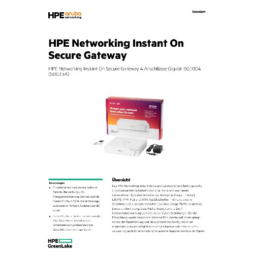 - Das HPE Networking Instant On Secure Gateway ist eine leistungsstarke, Cloud-verwaltete Sicherheitslösung für kleine und wachsende Unternehmen. Es bietet Sicherheit der Enterprise-Klasse – Firewall, IDS/IPS, VPN, PoE und WAN-Ausfallsicherheit – ohne versteckte Gebühren oder Lizenzen. Verwaltet über eine einzige Plattform bietet es Domänenblockierung, Deep Packet Inspection und 24x7-Netzwerküberwachung zum Schutz vor Cyber-Bedrohungen. Bei der Entwicklung wurde besonderer Wert auf Benutzerfreundlichkeit gelegt, sodass die Bereitstellung und die automatische Konfiguration mit minimalem Aufwand möglich sind und die Netzwerkeinrichtung und -verwaltung auch für technisch nicht versierte Benutzer machbar ist. Dieses Gateway ist ideal zum Sichern von Kundendaten, Transaktionen und Konnektivität mehrerer Standorte. Es bietet eine einfache, zuverlässige und auf die Bedürfnisse kleiner und mittlerer Unternehmen zugeschnittene Steuerung und kombiniert Einfachheit mit erstklassigem Schutz.