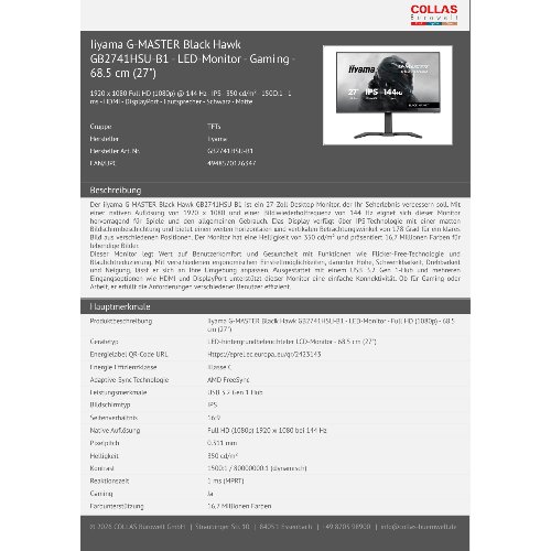- Der iiyama G-MASTER Black Hawk GB2741HSU-B1 ist ein 27-Zoll-Desktop-Monitor, der Ihr Seherlebnis verbessern soll. Mit einer nativen Auflösung von 1920 x 1080 und einer Bildwiederholfrequenz von 144 Hz eignet sich dieser Monitor hervorragend für Spiele und den allgemeinen Gebrauch. Das Display verfügt über IPS-Technologie mit einer matten Bildschirmbeschichtung und bietet einen weiten horizontalen und vertikalen Betrachtungswinkel von 178 Grad für ein klares Bild aus verschiedenen Positionen. Der Monitor hat eine Helligkeit von 350 cd/m² und präsentiert 16,7 Millionen Farben für lebendige Bilder.Dieser Monitor legt Wert auf Benutzerkomfort und Gesundheit mit Funktionen wie Flicker-Free-Technologie und Blaulichtreduzierung. Mit verschiedenen ergonomischen Einstellmöglichkeiten, darunter Höhe, Schwenkbarkeit, Drehbarkeit und Neigung, lässt er sich an Ihre Umgebung anpassen. Ausgestattet mit einem USB 3.2 Gen 1-Hub und mehreren Eingangsoptionen wie HDMI und DisplayPort unterstützt dieser Monitor eine einfache Konnektivität. Ob für Gaming oder Arbeit, er erfüllt die Anforderungen verschiedener Benutzer effizient.