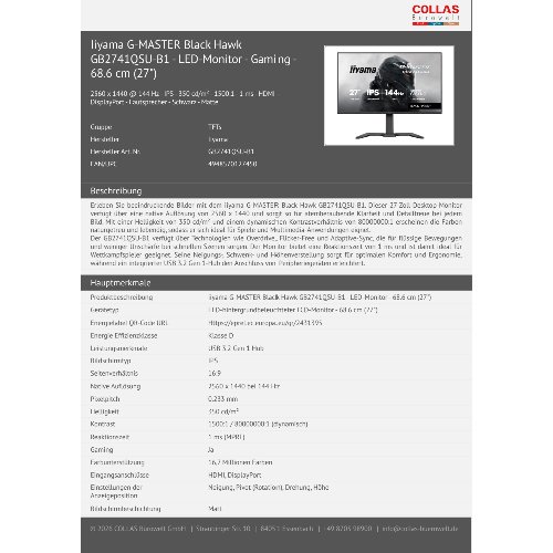 - Erleben Sie beeindruckende Bilder mit dem iiyama G-MASTER Black Hawk GB2741QSU-B1. Dieser 27-Zoll-Desktop-Monitor verfügt über eine native Auflösung von 2560 x 1440 und sorgt so für atemberaubende Klarheit und Detailtreue bei jedem Bild. Mit einer Helligkeit von 350 cd/m² und einem dynamischen Kontrastverhältnis von 80000000:1 erscheinen die Farben naturgetreu und lebendig, sodass er sich ideal für Spiele und Multimedia-Anwendungen eignet.Der GB2741QSU-B1 verfügt über Technologien wie Overdrive, Flicker-Free und Adaptive-Sync, die für flüssige Bewegungen und weniger Unschärfe bei schnellen Szenen sorgen. Der Monitor bietet eine Reaktionszeit von 1 ms und ist damit ideal für Wettkampfspieler geeignet. Seine Neigungs-, Schwenk- und Höhenverstellung sorgt für optimalen Komfort und Ergonomie, während ein integrierter USB 3.2 Gen 1-Hub den Anschluss von Peripheriegeräten erleichtert.