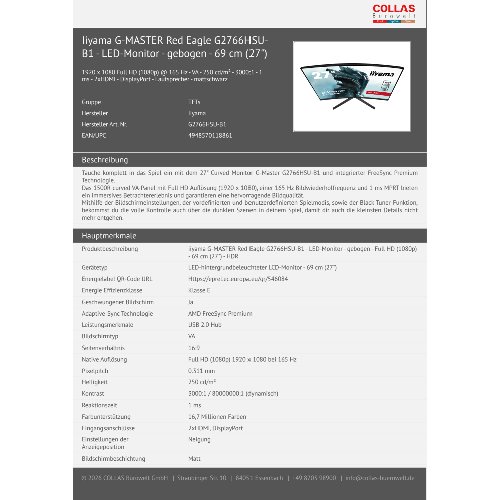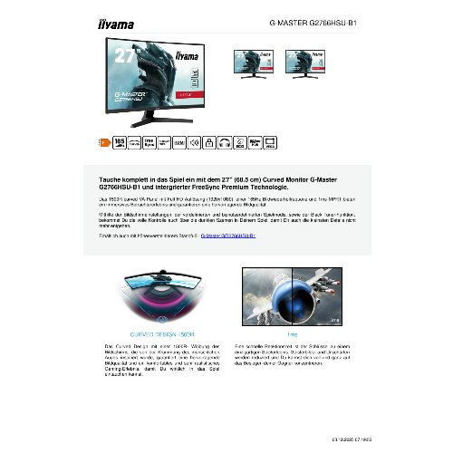 Jetzt anmeldenProduktinformationen "Iiyama G-MASTER Red Eagle G2766HSU-B1 - LED-Monitor - gebogen - 69 cm (27")"