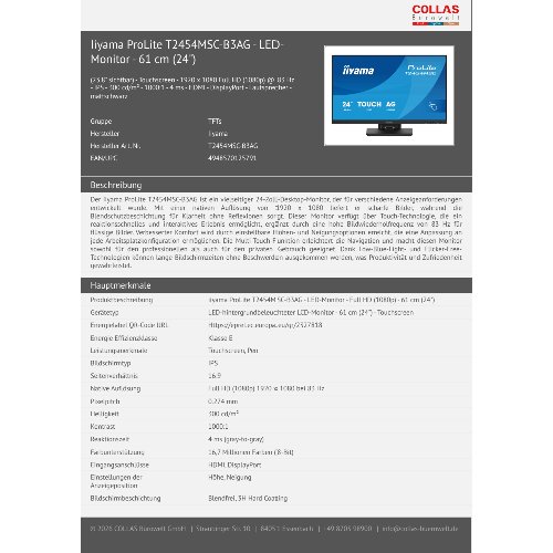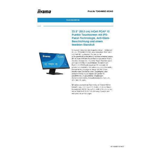 - Der iiyama ProLite T2454MSC-B3AG ist ein vielseitiger 24-Zoll-Desktop-Monitor, der für verschiedene Anzeigeanforderungen entwickelt wurde. Mit einer nativen Auflösung von 1920 x 1080 liefert er scharfe Bilder, während die Blendschutzbeschichtung für Klarheit ohne Reflexionen sorgt. Dieser Monitor verfügt über Touch-Technologie, die ein reaktionsschnelles und interaktives Erlebnis ermöglicht, ergänzt durch eine hohe Bildwiederholfrequenz von 83 Hz für flüssige Bilder. Verbesserter Komfort wird durch einstellbare Höhen- und Neigungsoptionen erreicht, die eine Anpassung an jede Arbeitsplatzkonfiguration ermöglichen. Die Multi-Touch-Funktion erleichtert die Navigation und macht diesen Monitor sowohl für den professionellen als auch für den privaten Gebrauch geeignet. Dank Low-Blue-Light- und Flicker-Free-Technologien können lange Bildschirmzeiten ohne Beschwerden ausgekommen werden, was Produktivität und Zufriedenheit gewährleistet.