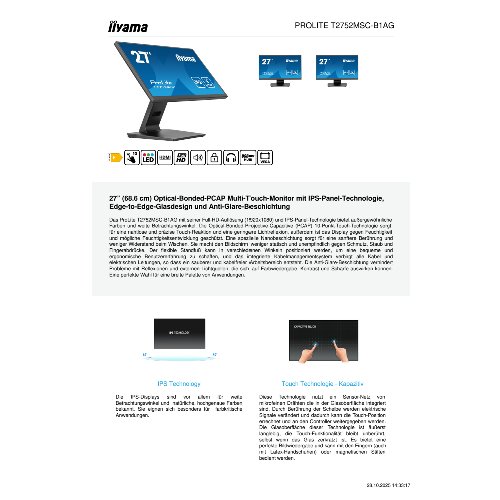 - Der iiyama ProLite T2752MSC-B1AG ist ein vielseitiger 27-Zoll-Touchscreen-Monitor, der hohe Leistung mit benutzerfreundlichen Funktionen kombiniert. Mit einer Full-HD-Auflösung von 1920 x 1080 und einem IPS-Panel liefert er lebendige Farben und klare Bilder aus verschiedenen Blickwinkeln. Der integrierte USB 3.2 Gen 1-Hub des Monitors ermöglicht eine einfache Verbindung von Peripheriegeräten, während die blendfreie und fingerabdruckfreie Beschichtung in jeder Umgebung für ein klares und sauberes Display sorgt. Dieser Monitor, der Komfort und Benutzerfreundlichkeit in den Vordergrund stellt, verfügt über eine 10-Punkt-Multitouch-Funktion und unterstützt eine Neigungswinkeleinstellung von -5 bis +90 Grad. Die Helligkeit von 400 cd/m² gewährleistet auch in gut beleuchteten Umgebungen eine gute Sichtbarkeit, während die Blaulichtreduzierungsfunktion ein angenehmes Betrachten bei längerer Nutzung fördert. Ob für Arbeit oder Unterhaltung, der iiyama ProLite T2752MSC-B1AG ist so konzipiert, dass er unterschiedliche Anforderungen effizient und effektiv erfüllt.