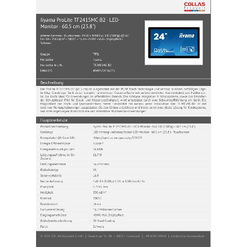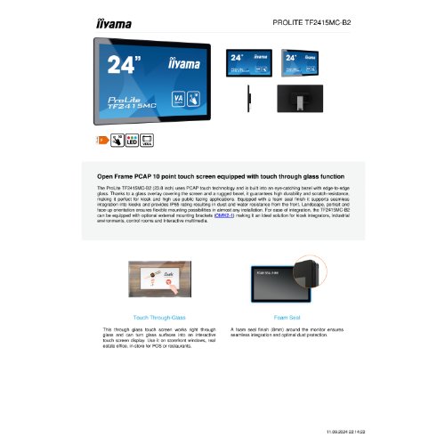 - Der ProLite TF2415MC-B2 (60.5 cm) ist ausgestattet mit der PCAP Touch Technologie und verbaut in einem auffälligen Edge-to-Edge Glasdesign. Dank dieser komplett rahmenlosen Glasoberfläche mit außerordentlicher Kratzfestigkeit und Haltbarkeit, ist das Gerät ideal für Anwendungen im öffentlichen Bereich. Die nahtlose Integration in Kiosksysteme, sowie das Erreichen der Schutzklasse IP65 für Staub- und Wasserbeständigkeit, wird unterstützt durch eine Schaumstoffdichtung am Gerät. Die Möglichkeit der Hoch- und Querausrichtung bietet Flexibilität bei nahezu jeder Installation. Der TF2415MC-B2 ist mit externen Montagehalterungen ausgestattet die den Einbau erleichtern und bietet somit eine ideale Lösung für Kiosksysteme, Industrieumgebungen, Kontrollräume und interaktive Multimedia-Anwendungen.