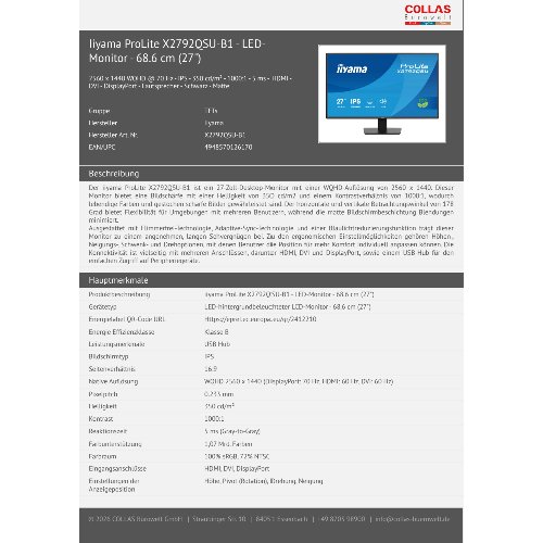 - Der iiyama ProLite X2792QSU-B1 ist ein 27-Zoll-Desktop-Monitor mit einer WQHD-Auflösung von 2560 x 1440. Dieser Monitor bietet eine Bildschärfe mit einer Helligkeit von 350 cd/m2 und einem Kontrastverhältnis von 1000:1, wodurch lebendige Farben und gestochen scharfe Bilder gewährleistet sind. Der horizontale und vertikale Betrachtungswinkel von 178 Grad bietet Flexibilität für Umgebungen mit mehreren Benutzern, während die matte Bildschirmbeschichtung Blendungen minimiert.Ausgestattet mit Flimmerfrei-Technologie, Adaptive-Sync-Technologie und einer Blaulichtreduzierungsfunktion trägt dieser Monitor zu einem angenehmen, langen Sehvergnügen bei. Zu den ergonomischen Einstellmöglichkeiten gehören Höhen-, Neigungs-, Schwenk- und Drehoptionen, mit denen Benutzer die Position für mehr Komfort individuell anpassen können. Die Konnektivität ist vielseitig mit mehreren Anschlüssen, darunter HDMI, DVI und DisplayPort, sowie einem USB-Hub für den einfachen Zugriff auf Peripheriegeräte.
