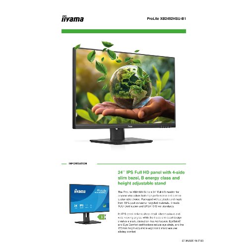 - Der iiyama ProLite XB2492HSU-B1 ist ein 24-Zoll-Desktop-Monitor, der für visuelle Leistung entwickelt wurde. Mit einer nativen Auflösung von 1920 x 1080 und einem Pixelabstand von 0,275 mm liefert er scharfe und lebendige Bilder. Die matte Beschichtung des Bildschirms verbessert die Bildschärfe und minimiert Reflexionen und Blendeffekte. Dieser Monitor verfügt über eine V-Sync-Rate von bis zu 120 Hz, die eine flüssige Bewegung bei schnellen Aktivitäten gewährleistet, sowie eine Reaktionszeit von 3 ms, die Geisterbilder und Unschärfen in dynamischen Szenen reduziert.Mit Technologien wie Flicker-Free und Blue Light Reducer fördert der iiyama ProLite XB2492HSU-B1 den Sehkomfort und ermöglicht eine längere Nutzung ohne Belastung der Augen. Der Monitor ist mit Höhen-, Schwenk-, Dreh- und Neigungsverstellungen ausgestattet, um ergonomische Blickwinkel zu gewährleisten. Mehrere Eingangsoptionen, darunter HDMI und DisplayPort, gewährleisten die Kompatibilität mit einer Reihe von Geräten und machen diesen Monitor zu einer wertvollen Ergänzung für jedes Büro oder Gaming-Setup.