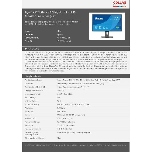 - Der iiyama ProLite XB2792QSU-B1 ist ein 27-Zoll-Desktop-Monitor für vielseitige Einsatzmöglichkeiten mit einer nativen Auflösung von 1920 x 1080 Pixeln. Dank IPS-Technologie erleben Sie lebendige Bilder mit einer hohen Helligkeit von 350 cd/m² und einem Kontrastverhältnis von 1500:1. Dieser Monitor unterstützt die Adaptive-Sync-Technologie und ist mit flimmerfreien Funktionen ausgestattet, wodurch er sich ideal für Spiele, Medienkonsum oder professionelle Arbeit eignet.Dank Funktionen wie einer V-Sync-Rate von 120 Hz und einer schnellen Reaktionszeit von 3 ms werden Bewegungsunschärfen minimiert und ein flüssiges Seherlebnis gewährleistet. Der Monitor verfügt über einen USB 3.2 Gen 1-Hub und mehrere Schnittstellen wie HDMI und DisplayPort für eine einfache Konnektivität. Durch die Einstellmöglichkeiten in Höhe, Neigung, Drehung und Schwenkung lässt er sich individuell ergonomisch anpassen, während das dreiseitige randlose Design für ein modernes und elegantes Erscheinungsbild sorgt.