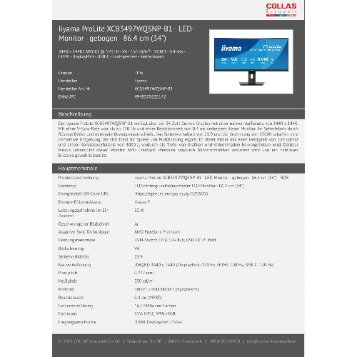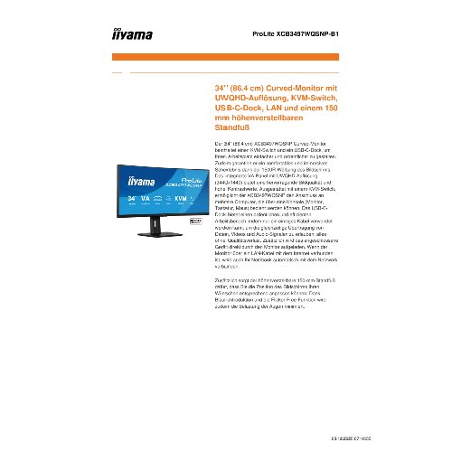 - Der iiyama ProLite XCB3497WQSNP-B1 verfügt über ein 34-Zoll-Curved-Display mit einer nativen Auflösung von 3440 x 1440. Mit einer V-Sync-Rate von bis zu 120 Hz und einer Reaktionszeit von 0,4 ms verbessert dieser Monitor Ihr Seherlebnis durch flüssige Bilder und minimale Bewegungsunschärfe. Das Seitenverhältnis von 21:9 und die Krümmung von 1500R schaffen eine immersive Umgebung, die sich ideal für Spiele und Multitasking eignet. Er bietet Bilder mit einer Helligkeit von 350 cd/m2 und einem Kontrastverhältnis von 3000:1, wodurch die Tiefe von Grafiken und Videoinhalten hervorgehoben wird. Darüber hinaus unterstützt dieser Monitor AMD FreeSync Premium, wodurch Bildschirmreißen reduziert wird und ein nahtloses Erlebnis gewährleistet ist.