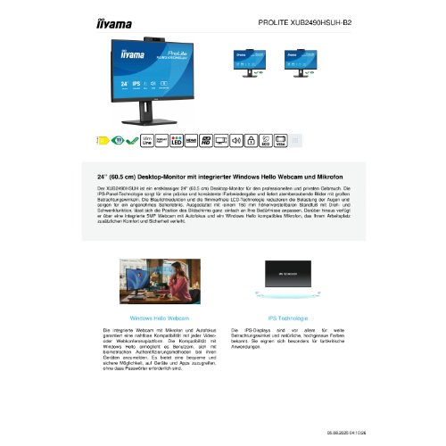 - Der iiyama ProLite XUB2490HSUH-B2 ist ein vielseitiger 24-Zoll-LCD-Monitor mit LED-Hintergrundbeleuchtung, der sowohl für Produktivität als auch für Unterhaltung konzipiert ist. Mit einer nativen Auflösung von 1920 x 1080 bietet er scharfe und lebendige Bilder, unterstützt durch einen weiten Betrachtungswinkel von 178 Grad, der dafür sorgt, dass die Farben aus jeder Position konsistent bleiben. Der Monitor verfügt über Technologien wie Adaptive-Sync für flüssigeres Gaming und eine Blaulichtreduzierungsfunktion, um die Belastung der Augen bei längerer Nutzung zu minimieren. Ausgestattet mit einer integrierten 5-Megapixel-Kamera und Stereolautsprechern eignet sich dieser Monitor für Videokonferenzen und Online-Meetings. Der USB 3.2 Gen 1-Hub ermöglicht den einfachen Anschluss mehrerer Geräte und ist somit die ideale Wahl für einen aufgeräumten Arbeitsplatz. Mit seinen Einstellmöglichkeiten für Höhe, Neigung und Drehung bietet dieser Monitor Flexibilität und ergonomischen Komfort für jeden Benutzer.