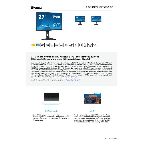 - Der iiyama ProLite XUB2793QS-B7 ist ein 27-Zoll-Desktop-Monitor mit einer Auflösung von 2560 x 1440 Pixeln, der gestochen scharfe und klare Bilder liefert. Mit einem Pixelabstand von 0,233 mm und einer Helligkeit von 300 cd/m² liefert dieser Monitor lebendige Bilder, die sich für Aufgaben von Spielen bis hin zu professionellen Arbeiten eignen. Die IPS-Technologie bietet einen weiten horizontalen und vertikalen Betrachtungswinkel von +89 / -89 Grad und ermöglicht so eine flexible Positionierung bei gleichzeitiger Reduzierung von Farbverzerrungen.Dieser Monitor verbindet Funktionalität mit Leistung und bietet eine Reaktionszeit von 1 ms und eine maximale V-Sync-Rate von 100 Hz, um Bewegungsunschärfen zu minimieren und die Benutzererfahrung in schnellen Umgebungen zu verbessern. Der Bildschirm ist außerdem mit der Flicker-Free-Technologie und einer Blue Light Reducer-Funktion ausgestattet, die eine komfortable Nutzung auch bei längeren Sitzungen ermöglicht. Der iiyama ProLite XUB2793QS-B7 verfügt über zahlreiche Anschlussmöglichkeiten wie HDMI und DisplayPort sowie ergonomische Einstellmöglichkeiten wie Höhe, Pivot, Dreh- und Neigefunktion und erfüllt damit die unterschiedlichsten Nutzeranforderungen.