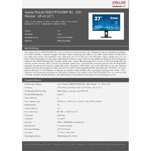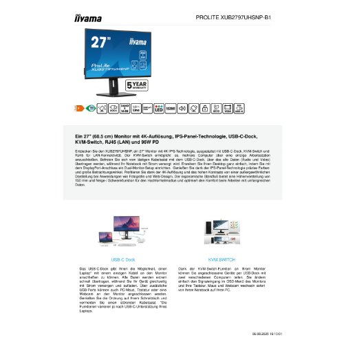 - Der iiyama ProLite XUB2797UHSNP-B1 ist ein 27-Zoll-Desktop-Monitor, der die Produktivität mit atemberaubenden Bildern und fortschrittlichen Funktionen steigert. Mit einer nativen Auflösung von 3840 x 2160 liefert dieser Monitor scharfe Bilder und lebendige Farben und unterstützt einen Farbraum von 99 % sRGB und 1,07 Milliarden Farben. Ausgestattet mit der Flicker-Free-Technologie und einer Blue Light Reducer-Funktion sorgt er für ein angenehmes Seherlebnis, auch bei längerem Gebrauch. Die IPS-Technologie des Monitors bietet einen weiten Betrachtungswinkel von bis zu 89 Grad horizontal und vertikal, so dass Benutzer ihren Bildschirm problemlos gemeinsam nutzen können, ohne Kompromisse bei der Bildqualität eingehen zu müssen. Der Monitor verfügt über einen integrierten KVM-Switch und einen USB-Hub, so dass der Benutzer bequem zwischen verschiedenen Geräten wechseln und seine Peripheriegeräte effizient verwalten kann. Mit einer USB-Power-Delivery-Fähigkeit von 96 Watt kann er Laptops und Geräte nahtlos aufladen. Das ergonomische Design bietet Höhen-, Dreh-, Schwenk- und Neigungseinstellungen für optimalen Sehkomfort. Der iiyama ProLite XUB2797UHSNP-B1 ist für professionelle Anwender geeignet, die eine effiziente und optisch ansprechende Bildschirmlösung für ihren Arbeitsplatz suchen.