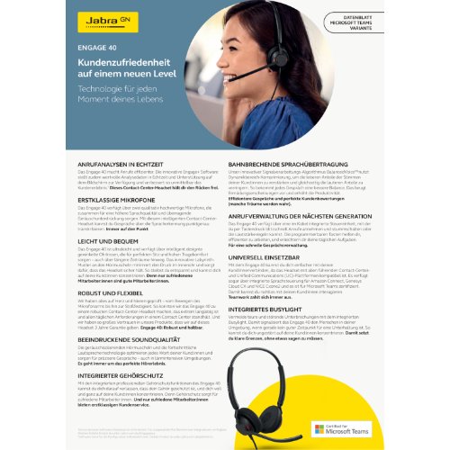 • Entdecke das Jabra Engage 40: die neue Generation von Contact-Center-Headsets. Jetzt hast du es selbst in der Hand, die Kundenzufriedenheit zu verbessern. Unsere Engage+ Software bietet intelligente Anrufanalysen in Echtzeit. Damit lässt sich die Leistung von Contact-Center-Mitarbeiter:innen steigern und die Kundenzufriedenheit verbessern. Mit der innovativen Sprachoptimierung, Gehörschutz und dem leistungsstarken 2-Mikrofon-System verbessert das Headset das gesamte Sounderlebnis. Dank des ultraleichten und dennoch langlebigen Designs ist es außerdem sehr angenehm zu tragen. Die flexible Passform sowie bequeme Ohrkissen sorgen für hohen Tragekomfort und verbesserte Geräuschisolierung. Du konzentrierst dich auf das Wesentliche. Wir kümmern uns um den Rest.