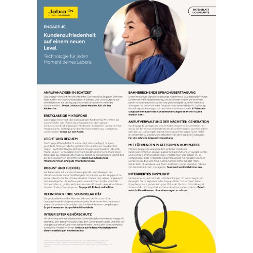 - Entdecke das Jabra Engage 40: die neue Generation von Contact-Center-Headsets. Jetzt hast du es selbst in der Hand, die Kundenzufriedenheit zu verbessern. Unsere Engage+ Software bietet intelligente Anrufanalysen in Echtzeit. Damit lässt sich die Leistung von Contact-Center-Mitarbeiter:innen steigern und die Kundenzufriedenheit verbessern. Mit der innovativen Sprachoptimierung, Gehörschutz und dem leistungsstarken 2-Mikrofon-System verbessert das Headset das gesamte Sounderlebnis. Dank des ultraleichten und dennoch langlebigen Designs ist es außerdem sehr angenehm zu tragen. Die flexible Passform sowie bequeme Ohrkissen sorgen für hohen Tragekomfort und verbesserte Geräuschisolierung. Du konzentrierst dich auf das Wesentliche. Wir kümmern uns um den Rest.