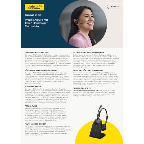 - Das schnurlose Headset-System Jabra Engage 45 SE Mono wurde entwickelt, um die Anforderungen professioneller Kommunikations- und Sprachanwendungen zu erfüllen. Dank der schnurlosen DECT-Technologie genießen die Benutzer eine Bewegungsfreiheit von bis zu 150 m, die herkömmliche kabelgebundene Headsets nicht bieten können. Das Headset verfügt über Wideband-HD-Audiotechnologie und digitale Signalverarbeitung, so dass jedes Gespräch kristallklar zu verstehen ist.Das am Bügel befestigte Mikrofon nimmt die Stimme präzise auf, so dass jeder Anruf so verständlich ist wie ein persönliches Gespräch. Die Bedienelemente zum Annehmen/Beenden, Stummschalten und für die Lautstärke befinden sich bequem am Headset und ermöglichen ein müheloses Anrufmanagement. Darüber hinaus hilft die Besetztanzeige, Unterbrechungen zu minimieren, indem sie anderen signalisiert, dass Sie ein Gespräch führen.Die auf Komfort und Langlebigkeit ausgelegten On-Ear-Kopfhörer bieten ganztägigen Tragekomfort, und die Akkulaufzeit unterstützt mit einer Standby-Zeit von bis zu 52 Stunden eine intensive Nutzung. Das Jabra Engage 45 SE Mono ist nicht einfach nur ein Headset, sondern eine umfassende Lösung für professionelle Anwender, die außergewöhnliche Audioqualität, kabellose Freiheit und einfache Bedienung suchen.