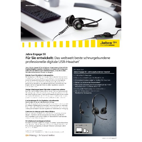 - Jabra hat das Engage 50 für Softphone-Umgebungen entwickelt. Das Headset integriert spezielle Funktionen, mit denen sich Hintergrundgeräusche und Ablenkungen reduzieren lassen. Mit seiner einzigartigen 3-Mikrofon-Technologie bietet es hervorragende Gesprächsqualität selbst in lärmintensiven Büroumgebungen. Mehrfarbige Status-LEDs helfen Ablenkungen zu vermeiden. Damit trägt das Engage 50 dazu bei, die Kundenzufriedenheit zu steigern. Die Jabra Software sendet Live-Anweisungen zur optimalen Mikrofonposition auf die Bildschirme der Mitarbeiter. Die umfassende Anrufanalyse ermöglicht die proaktivere Kontrolle der Kundenerfahrung.