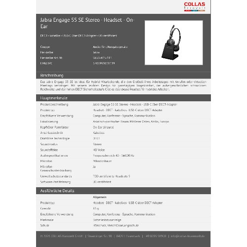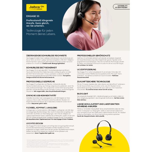 - Das Jabra Engage 55 SE ist ideal für Hybrid-Mitarbeitende, die den Großteil ihres Arbeitstages mit Anrufen oder virtuellen Meetings verbringen. Mit seinem leichten Design für ganztägigen Tragekomfort, der außergewöhnlichen schnurlosen Reichweite und der hohen DECT-Sicherheitsstufe C ist es das ideale Headset für hybrides Arbeiten.