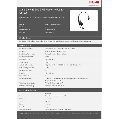 Jetzt anmeldenProduktinformationen "Jabra Evolve2 30 SE MS Mono - Headset - On-Ear"