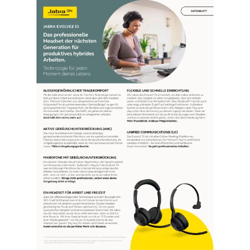 - Für jeden Zweck geeignet. Das professionelle Headset, mit dem du alle Aufgaben erledigen kannst, die dein hybrider Arbeitstag mit sich bringt. Geschäftliche Anrufe vom Gästezimmer aus, Motivations-Playlists vor einem wichtigen Pitch oder meditative Musik für die Momente, in denen du dich konzentrieren musst. An hybriden Arbeitstagen ist viel los und dein Headset muss immer mithalten können.Das Evolve2 55 ist speziell für dich und deine Arbeitsweise entwickelt. Damit kannst du genau so arbeiten, wie du möchtest. Das Headset bietet professionellen Sound für deine Anrufe und Musikwiedergabe - mit leistungsstarker aktiver Geräuschunterdrückung (ANC), geräuschunterdrückenden Mikrofonen und speziellen 28 mm großen Lautsprechern. Darüber hinaus profitierst du dank revolutionären Jabra Air Comfort Technologie.