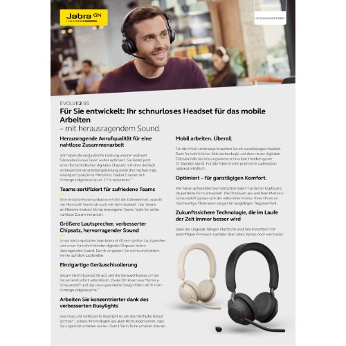 - Entwickelt, um Ihre Arbeit flexibler zu gestalten. Arbeiten Sie überall mit hervorragender kabelloser Audioleistung. Hervorragende Ergebnisse erfordern eine exzellente Gesprächsleistung, und unterbrechungsfreier professioneller Ton macht wirklich einen Unterschied. Die Gesprächsleistung der weltweit führenden Evolve-Serie wurde durch die Integration von drei leistungsstarken, strategisch platzierten Profi-Mikrofonen, den fortschrittlichen digitalen Chipsatz und die neueste Signalverarbeitungstechnologie weiter verbessert. Das Ergebnis ist eine herausragende Gesprächsqualität - jedes Mal.Diese Headsets verfügen über leistungsstarke 40-mm-Lautsprecher, die Signalstabilität garantieren, und wurden mit dem fortschrittlichsten digitalen Chipsatz aller Zeiten ausgestattet. Mit der Evolve-Serie können Sie während der Arbeit garantiert Musik in bester Qualität hören. Mit der Evolve2-Serie erreicht die Audioqualität ein noch höheres Niveau.Hintergrundgeräusche können Ihren Arbeitsablauf stören, ob im Büro oder unterwegs. Wenn Sie den Evolve2 65 Kopfhörer tragen, verschwinden die Geräusche um Sie herum sofort, dank des isolierenden Schaumstoffs in den ovalen Ohrpolstern und dem bahnbrechenden Design der abgewinkelten Ohrmuscheln, die Außengeräusche effektiv abblocken und Ihnen eine beispiellose passive Geräuschunterdrückung bieten.