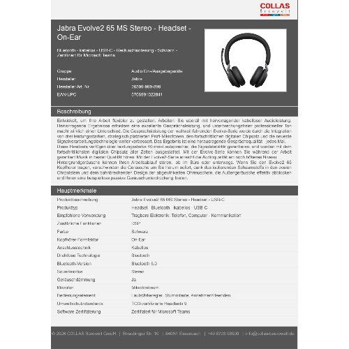 Jetzt anmeldenProduktinformationen "Jabra Evolve2 65 MS Stereo - Headset - On-Ear"