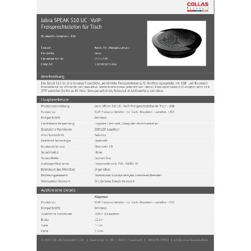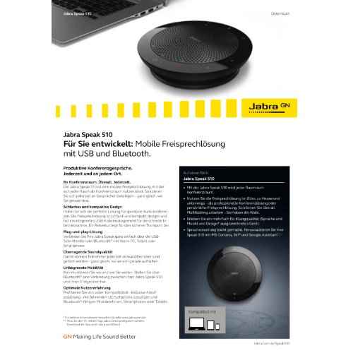 - Das Speak 510 ist eine benutzerfreundliche, persönliche Freisprechlösung für Konferenzgespräche mit USB- und Bluetooth -Konnektivität für effiziente und produktive Telefonkonferenzen jederzeit und überall. Dank optionalem USB-Adapter Jabra Link 370* genießen Sie bis zu 30 Meter Bewegungsfreiheit. Reiseetui im Lieferumfang enthalten.