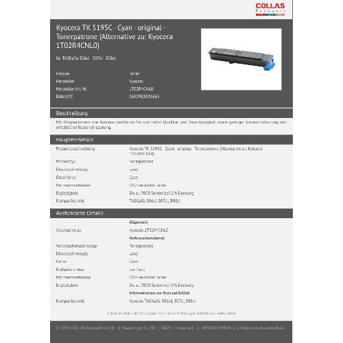 Jetzt anmeldenProduktinformationen "Kyocera TK 5195C - Cyan - original - Tonerpatrone (Alternative zu: Kyocera 1T02R4CNL0)"