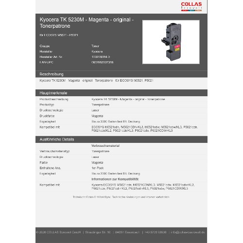 Jetzt anmeldenProduktinformationen "Kyocera TK 5230M - Magenta - original - Tonerpatrone"
