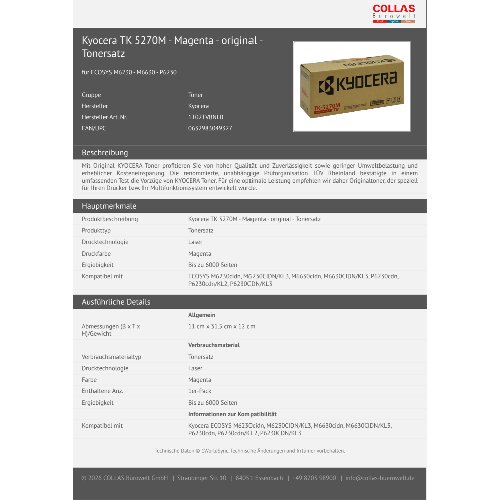 Jetzt anmeldenProduktinformationen "Kyocera TK 5270M - Magenta - original - Tonersatz"