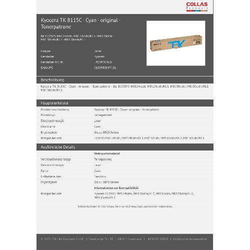 Jetzt anmeldenProduktinformationen "Kyocera TK 8115C - Cyan - original - Tonerpatrone"
