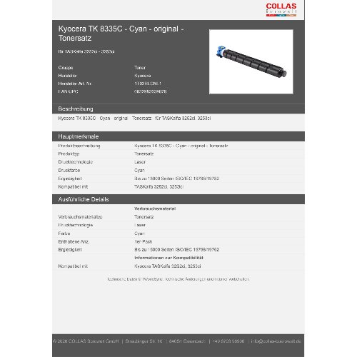 Jetzt anmeldenProduktinformationen "Kyocera TK 8335C - Cyan - original - Tonersatz"