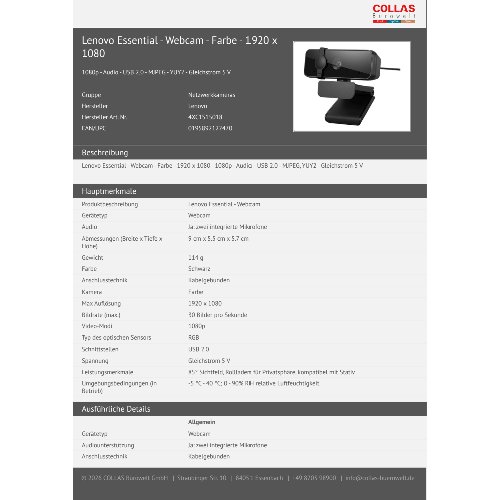 Jetzt anmeldenProduktinformationen "Lenovo Essential - Webcam - Farbe - 1920 x 1080"