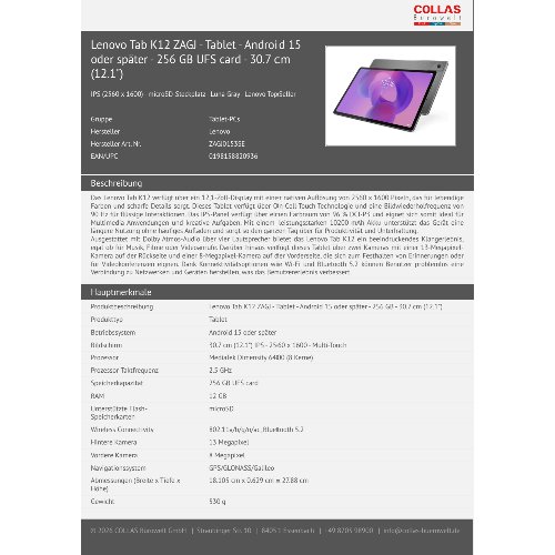 Jetzt anmeldenProduktinformationen "Lenovo Tab K12 ZAGJ - Tablet - Android 15 oder später - 256 GB UFS card - 30.7 cm (12.1")"
