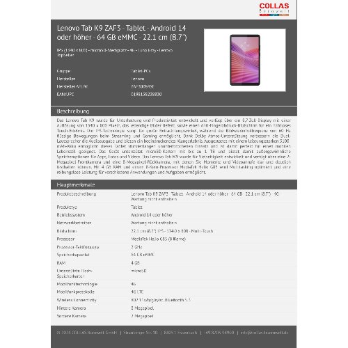 Jetzt anmeldenProduktinformationen "Lenovo Tab K9 ZAF3 - Tablet - Android 14 oder höher - 64 GB eMMC - 22.1 cm (8.7")"
