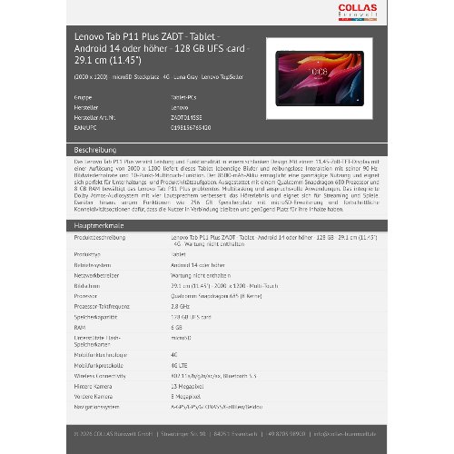 Jetzt anmeldenProduktinformationen "Lenovo Tab P11 Plus ZADT - Tablet - Android 14 oder höher - 128 GB UFS card - 29.1 cm (11.45")"