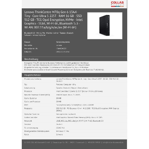 Lenovo ThinkCentre M70q Gen 6 13A4 - Tiny - Core Ultra 5 225T - RAM 16 GB - SSD 512 GB - TCG Opal Encryption, NVMe - Intel Graphics - 1GbE, Wi-Fi 6E, Bluetooth 5.3 - WLAN: 802.11a/b/g/n/ac/ax (Wi-Fi 6E)
