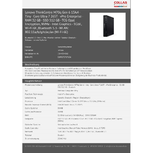 Lenovo ThinkCentre M70q Gen 6 13A4 - Tiny - Core Ultra 7 265T - vPro Enterprise - RAM 32 GB - SSD 512 GB - TCG Opal Encryption, NVMe - Intel Graphics - 1GbE, Wi-Fi 6E, Bluetooth 5.3 - WLAN: 802.11a/b/g/n/ac/ax (Wi-Fi 6E)
