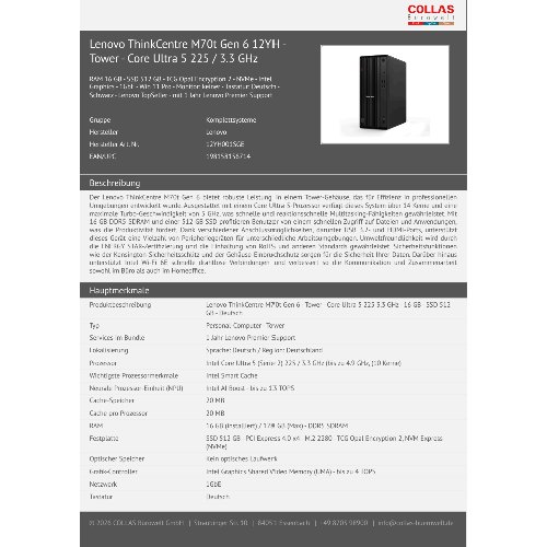 Jetzt anmeldenProduktinformationen "Lenovo ThinkCentre M70t Gen 6 12YH - Tower - Core Ultra 5 225 / 3.3 GHz"