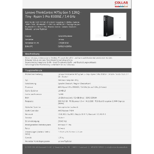 Jetzt anmeldenProduktinformationen "Lenovo ThinkCentre M75q Gen 5 12RQ - Tiny - Ryzen 5 Pro 8500GE / 3.4 GHz"