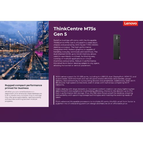- Das Lenovo ThinkCentre M75s Gen 5 wurde entwickelt, um sowohl Leistung als auch Effizienz für den modernen Profi zu bieten. Sein Herzstück, ein AMD Ryzen 5 8500G Prozessor mit 6 Kernen und 16 GB DDR5 RAM, bietet die nötige Leistung für anspruchsvolle Anwendungen und Multitasking. Die 512 GB SSD, die NVMe-Technologie und TCG Opal Encryption 2 nutzt, bietet reichlich Speicherplatz mit verbesserter Sicherheit und schnellem Datenzugriff.Die Konnektivität ist vielseitig, mit USB 3.2 Gen 1-Anschlüssen, USB-C und mehreren Videoausgängen, einschließlich DisplayPort 1.4a und HDMI, die eine einfache Verbindung mit einer Vielzahl von Geräten und Bildschirmen ermöglichen. Das Small-Form-Factor-Gehäuse ist nicht nur platzsparend, sondern verfügt auch über ein 90 % effizientes Netzteil und unterstreicht mit seinen ENERGY STAR 8.0- und EPEAT Gold-Zertifizierungen das Engagement für Energieeffizienz.Die Sicherheitsfunktionen sind umfassend und umfassen einen diskreten TPM 2.0-Chip, einen Pluton-Sicherheitsprozessor und einen Kensington-Sicherheitsschlitz zum Schutz vor physischen und digitalen Bedrohungen. Ob im Beruf oder in der Freizeit - das Lenovo ThinkCentre M75s Gen 5 ist eine intelligente, sichere und nachhaltige Wahl.