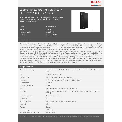Jetzt anmeldenProduktinformationen "Lenovo ThinkCentre M75s Gen 5 12TA - SFF - Ryzen 5 8500G / 3.5 GHz"