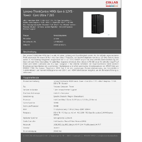 Jetzt anmeldenProduktinformationen "Lenovo ThinkCentre M90t Gen 6 12YS - Tower - Core Ultra 7 265"