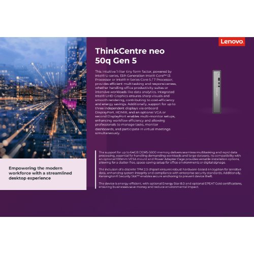 - Der Lenovo ThinkCentre neo 50q Gen 5 im ultrakompakten Formfaktor ist auf Effizienz und Leistung ausgelegt. Ausgestattet mit einem Intel Core i3-Prozessor und DDR5-SDRAM bewältigt dieser PC Multitasking bei minimalem Platzbedarf auf dem Schreibtisch. Das winzige Gehäuse lässt sich nahtlos in jeden Arbeitsbereich integrieren und ist somit die ideale Wahl für den Einsatz zu Hause oder im Büro.Dank hochauflösender Audio-Standards, integriertem Realtek ALC256-Audio-Codec und eingebautem Lautsprecher bleibt die Klangqualität klar und deutlich. Das System verfügt über eine Reihe von Anschlussmöglichkeiten, darunter USB 3.2 Gen 2, HDMI, DisplayPort 1.4 und Gigabit-Ethernet, und erfüllt damit alle Anforderungen an die Vernetzung. Das Netzteil liefert eine effiziente Leistung, hält den Energieverbrauch niedrig und bietet gleichzeitig robuste Funktionen für eine Vielzahl von Anwendungen.