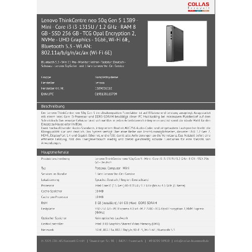 Jetzt anmeldenProduktinformationen "Lenovo ThinkCentre neo 50q Gen 5 13B9 - Mini - Core i3 i3-1315U / 1.2 GHz - RAM 8 GB - SSD 256 GB - TCG Opal Encryption 2, NVMe - UHD Graphics - 1GbE, Wi-Fi 6E, Bluetooth 5.3 - WLAN: 802.11a/b/g/n/ac/ax (Wi-Fi 6E)"
